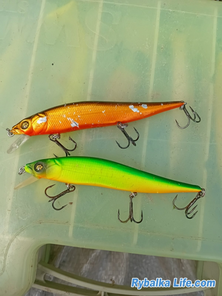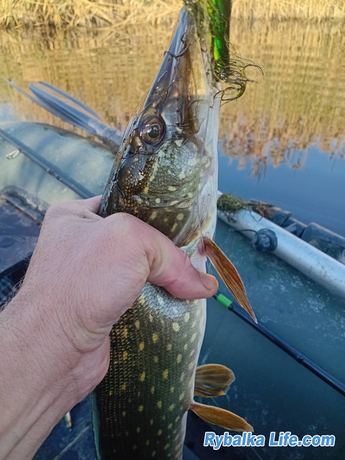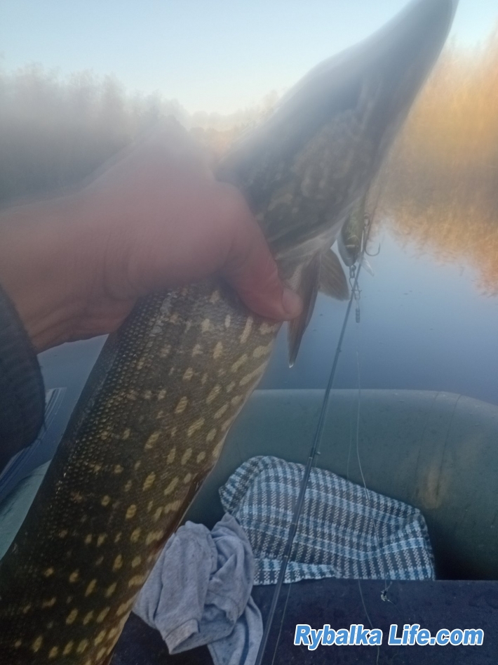 Дальше река поворачивает налево и делает узкий проход. Глубина 1.5 метра, это по нормальному уровню воды. Сейчас там примерно метр дватцать. Сколько я раньше в этих проходах переловил щук. И сейчас я знаю ,что она там есть и не одна. Ставляю Crek Jack 78 SP и на коротких рывочках сильный удар хорошей щуки. Вываживание, сопротивление и щука в подсаке. Делаю фото в полном тумане. Щука в районе полторушки. Дальше проход заканчивается и впереди опять мелководный участок. И тут лучшие свои качества раскрывает воблер от компании Fishing Roj Fusion 98SP в кислотном окрасе. Щучка ловиться разная от 500 грамм до кило. И вообще мне хочеться сказать про этот воблерок. Он ловит у меня везде по мелякам. На прудах он вообще у меня фаворит. Так что кому интересно обратите внимание. Воблер ловит и стоит не больших денег.