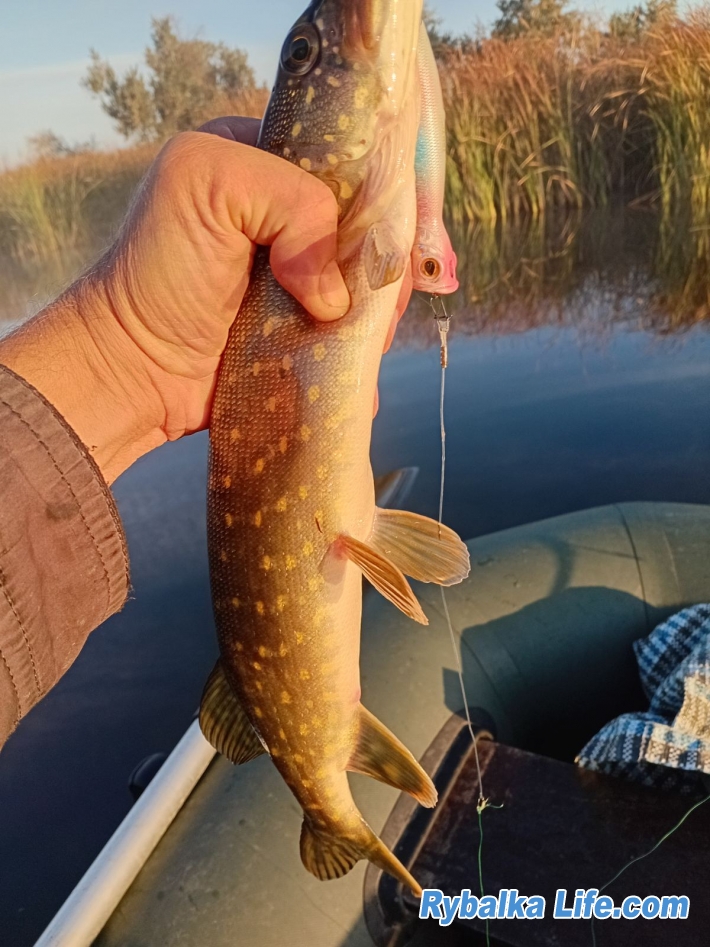Первым делом начинаю ловлю с меляков. Плыву от кладбища вправо и облавливаю прибрежний камыш. На глубине поклевок нет. И пока я один на реке пытаюсь как можно больше обловить перспективных мест. Все таки опыт ловли в этих местах у меня есть. Дохожу до первого мелководного участка. Ставлю поппер от Цуеки, не помню названия. Приманка крупная и тяжелая, летит очень далеко. Реплика на какой то японский бренд. Заброс. И только воблер сделал два хлюпанья, как следует яросная атака щучки. Аккуратно освобождаю и отпускаю. Ловить на поверхностные приманки зрелище еще то. Весь спектакль событий у тебя перед глазами. Дальше тоже выход, но промах. Лично мне ловить на попперы очень нравиться.