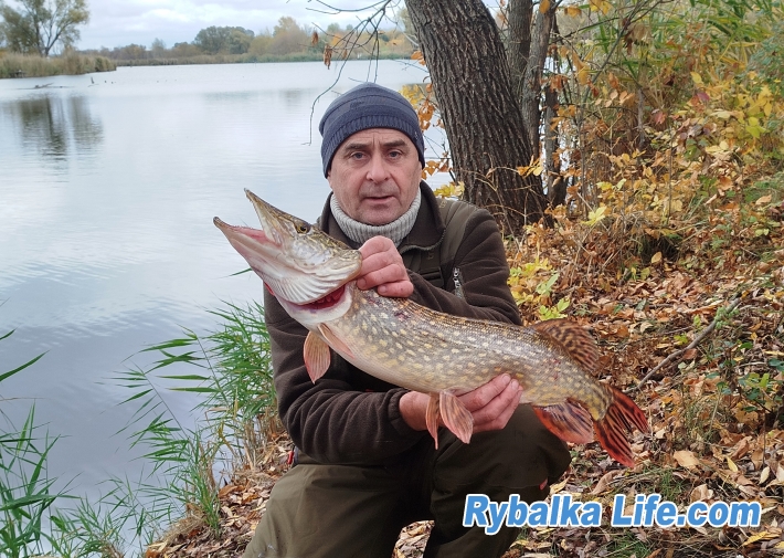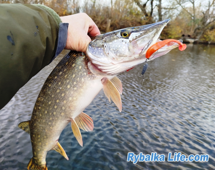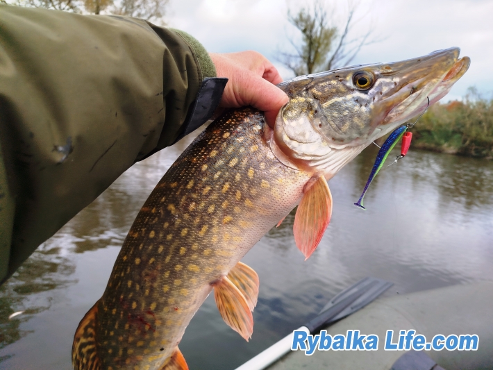 Поосле короткой фотоссесии, бросяю якорь уже в левом придамбовом углу. Как раз из-за туч выглянуло осеннее солнце. У меня есть устойчивое убеждение, что в солнечную погоду по силикону лучше работают ультрафиолетовые цвета. Быстренько ставлю первое, что попалось на глаза - Shainer от FR 100mm #143. И буквально на третьем забросе еще одна щука на 2.2кг.позирует на телефон.
