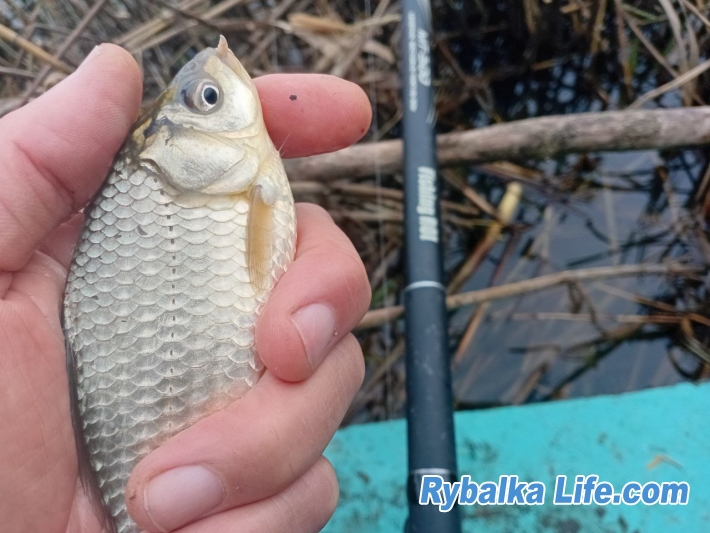 У меня пол часа без поклевки. Сначала ловил на одну удочку, а потом забросил и вторую. И вот они первые поклевки. Поплавок ведёт в сторону... есть карасик! Рыба не крупная, но сопротивляется бойко.