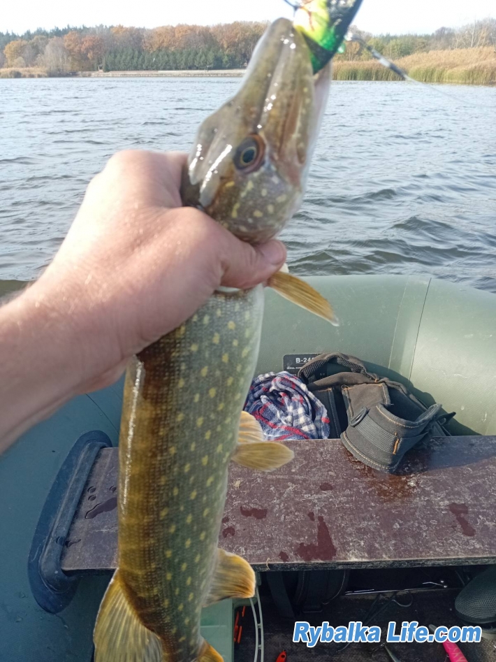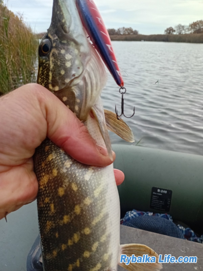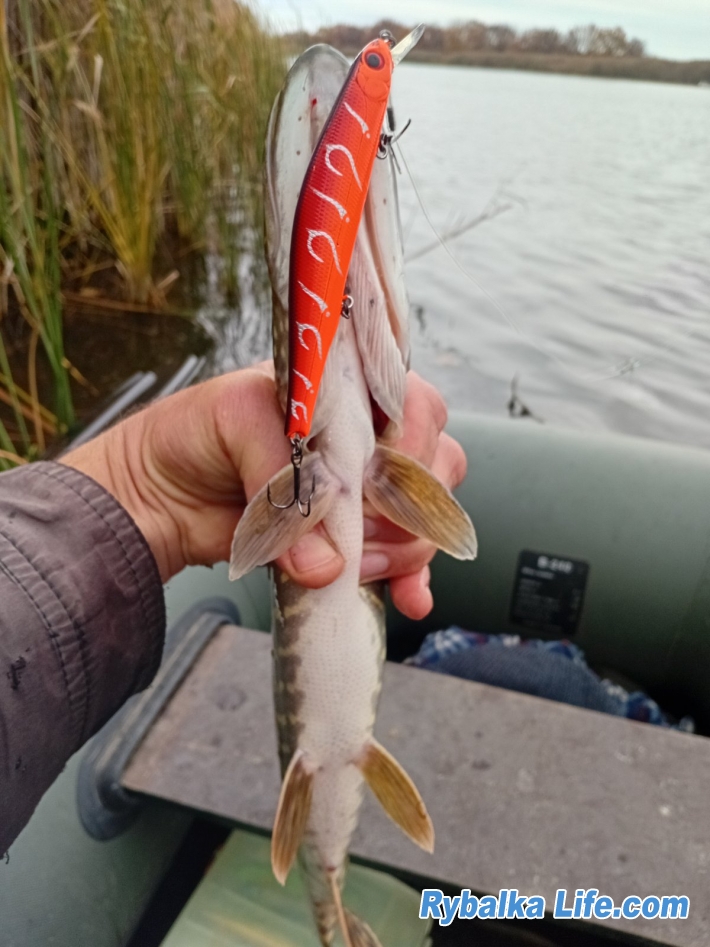 Возле машины пришвартовался, и вышел на берег на обед. Мои друзья уже за столом, и моя порция полная з горой. Спросил у них как рыбалка на троллинг, ответ практически отрицательный. По несколько щучек на брата. Не густо. Во время плаванья я постоянно спрашивал у других троллингистов о результате рыбалки. И тоже было слабо. А те кто ловил в заброс вообще ни как. Виной тому наверное была грязная вода в речке, а может и «удачи», не знаю. Подкрепившись я вышел опять на воду, но уже в противоположную сторону. У меня в зачете пару щучек килушных, и по такой рыбалке еще хорошо. Пол часа – ноль. Ну что выручай «мистер Орбит», если не ты, то ни кто. Ставлю Zip Baits Orbit SP-SR Red Tiger заброс под камыш и рывковая проводка и сразу поклевка чуть за килушной щуки. Отлично. Потом еще пару снимаю. Вот он уровень приманки. Орыгинал есть орыгинал! Коментарии излишни!