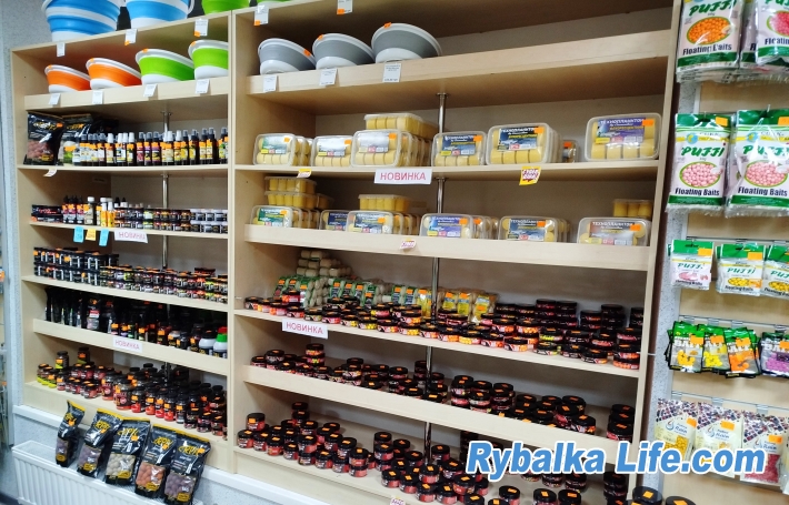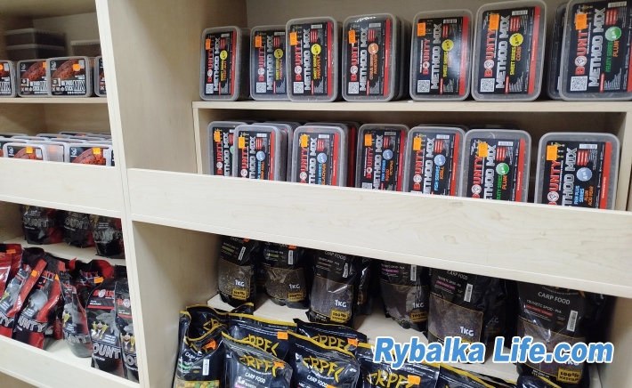 Окремий зал відведений під різноманітні прикормки, бойли, ароматизатори, зернові суміші, технопланктон.